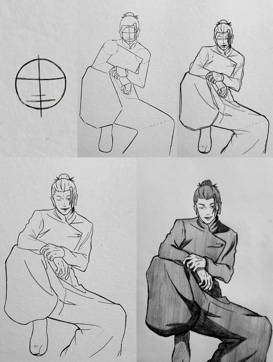 In the final stage, the rough construction marks are cleaned up, and smooth pencil shading is applied. Darker tones are added to one side of the outfit and beneath the legs to create depth and contrast, while lighter shading maintains softness in the fabric folds. The result is a balanced and expressive illustration of Suguru Geto, focusing on pose construction, clean linework, and subtle shading for a polished anime finish.