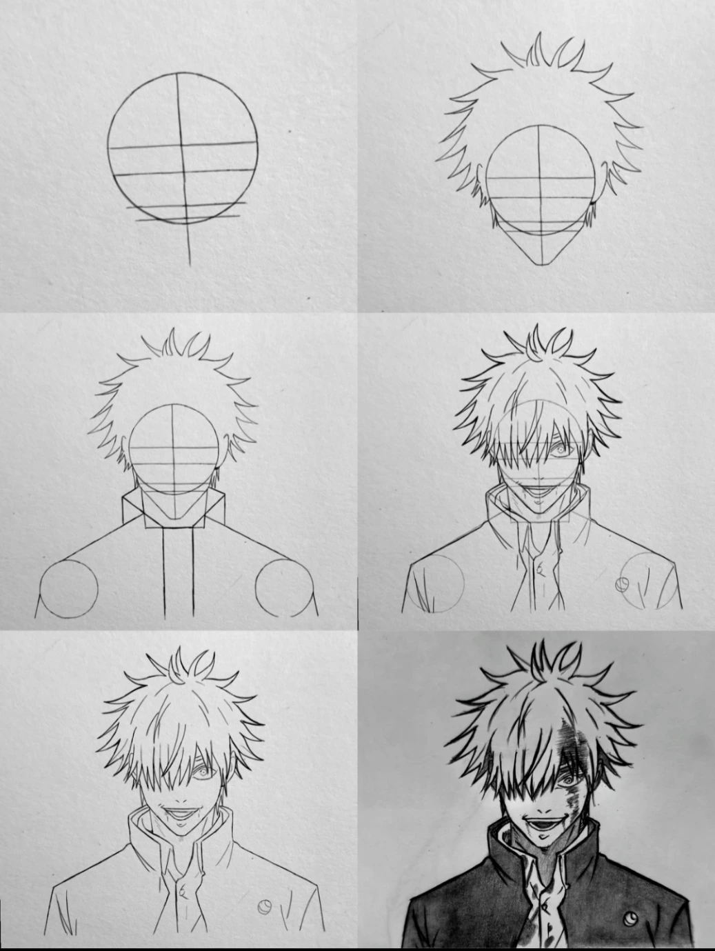 The final image perfectly captures Gojo's "Limitless" energy. The transition from a simple circle to a gritty, shaded warrior shows the importance of building a drawing layer by layer.