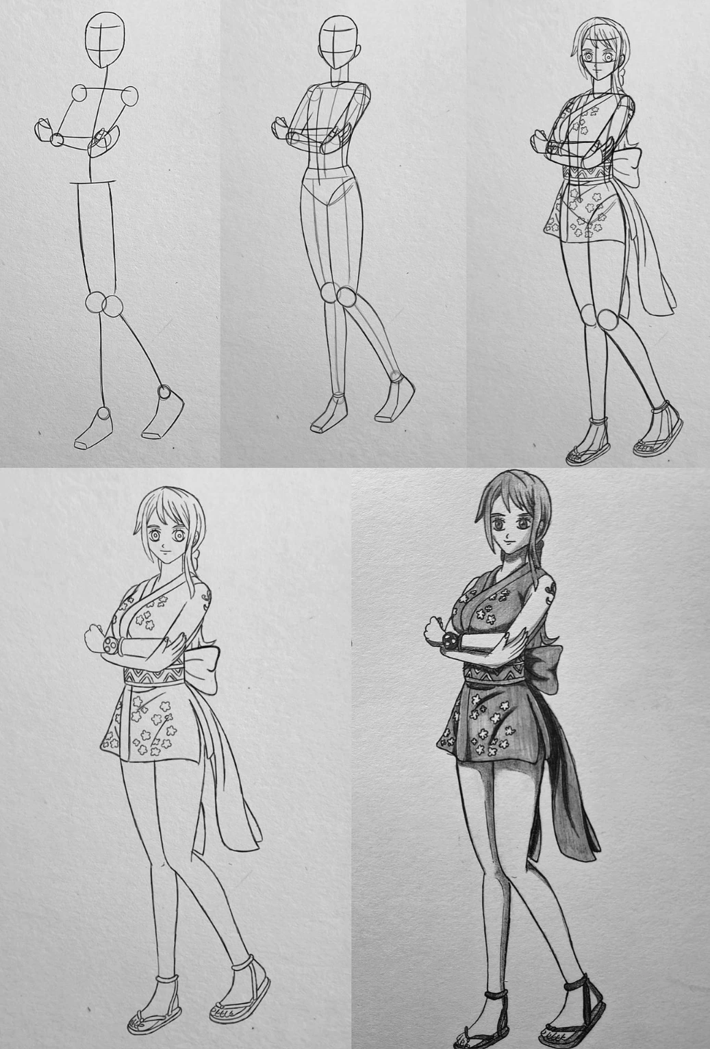 Nami’s large anime-style eyes, small nose, and soft smile are drawn. Her medium-length hair is sketched flowing down with side bangs framing the face. The short kimono-style dress is added with floral patterns. The wide obi belt and large bow at the back are drawn, along with the long flowing ribbon tails. Arms are refined in their folded position.