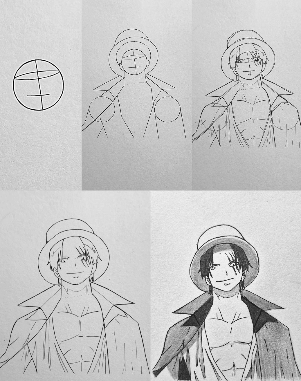 This step-by-step drawing tutorial beautifully demonstrates the complete upper-body construction of Shanks from One Piece. The process focuses on building strong structure first, then gradually refining features, clothing, and shading to achieve a polished and dimensional anime portrait.