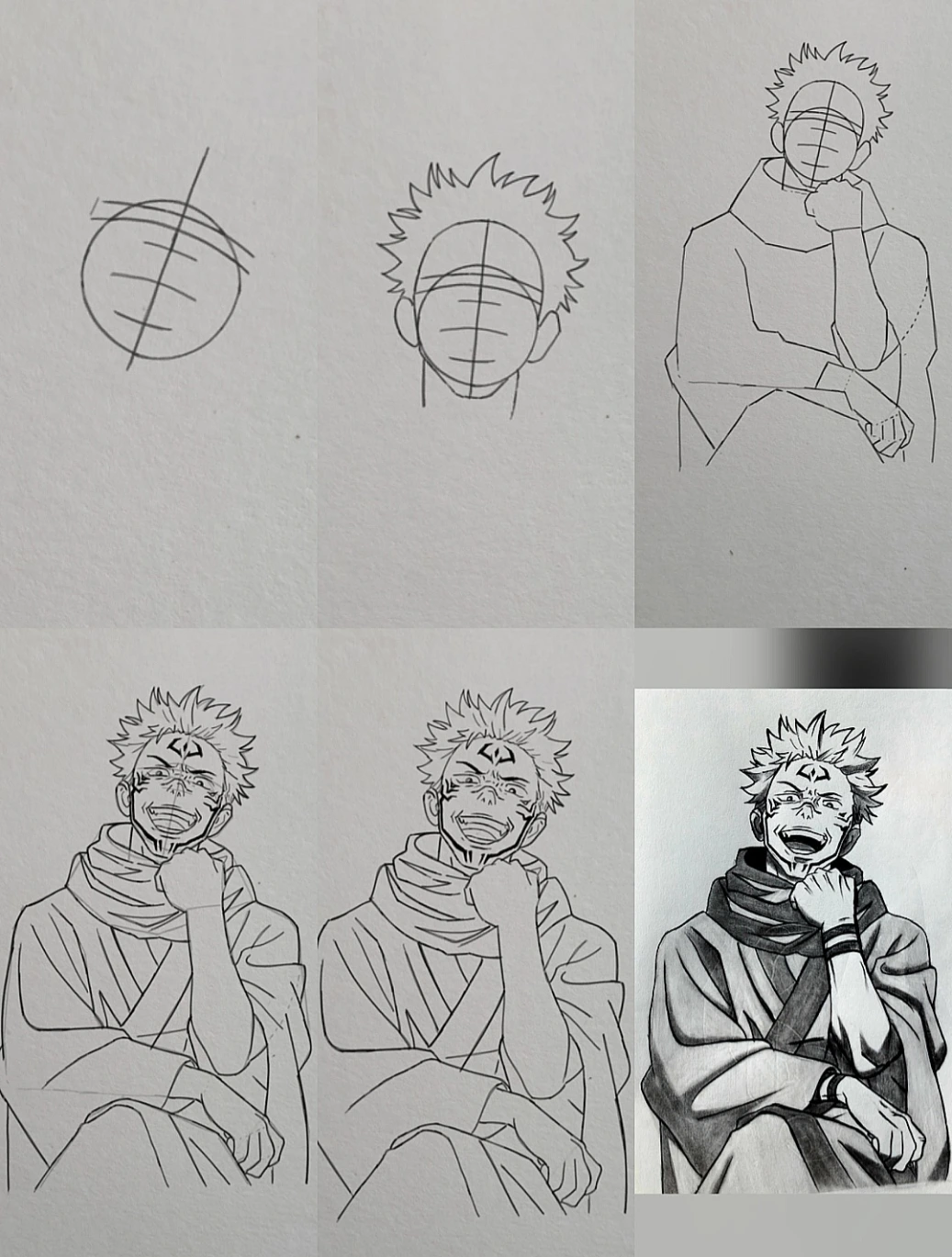 Step 6: Masterful Shading: The final stage uses heavy pencil or ink shading to add depth and "weight" to the clothing. The dark, dramatic shadows emphasize Sukuna’s intimidating presence and the texture of his robes.