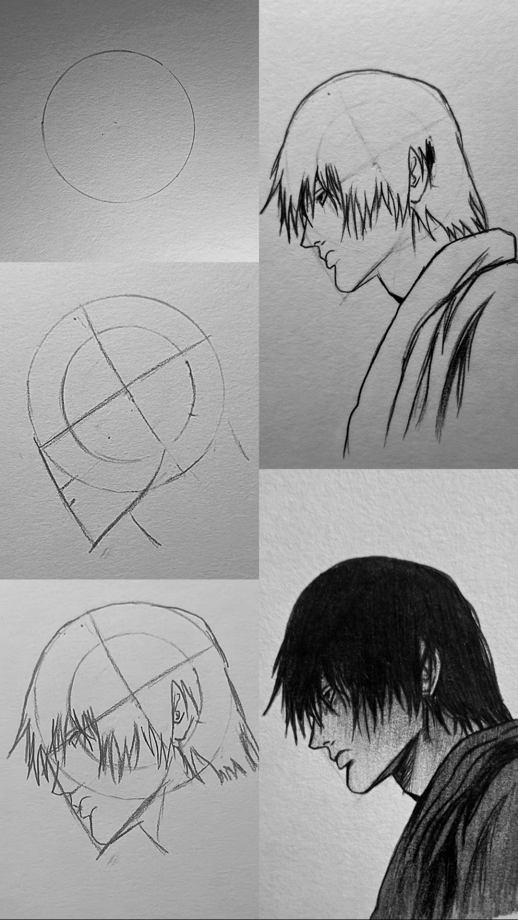 The process begins with a simple circle to establish the skull structure. A vertical and angled horizontal guideline are added to define the head tilt and viewing direction. An inner circle is lightly sketched to better understand facial placement and depth, which is especially important for accurate side profiles.
