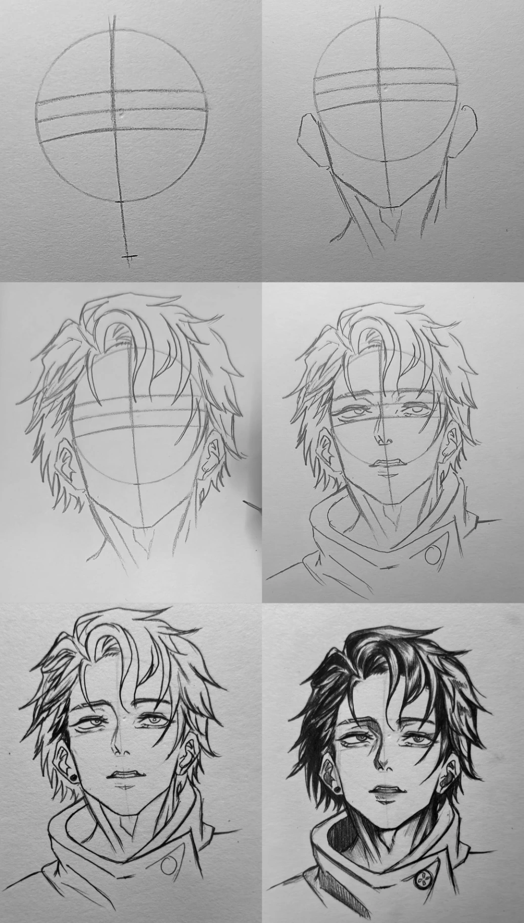 This step-by-step tutorial shows how to draw Yuta Okkotsu from Jujutsu Kaisen, following the exact progression shown in the image — from basic construction to final shading.